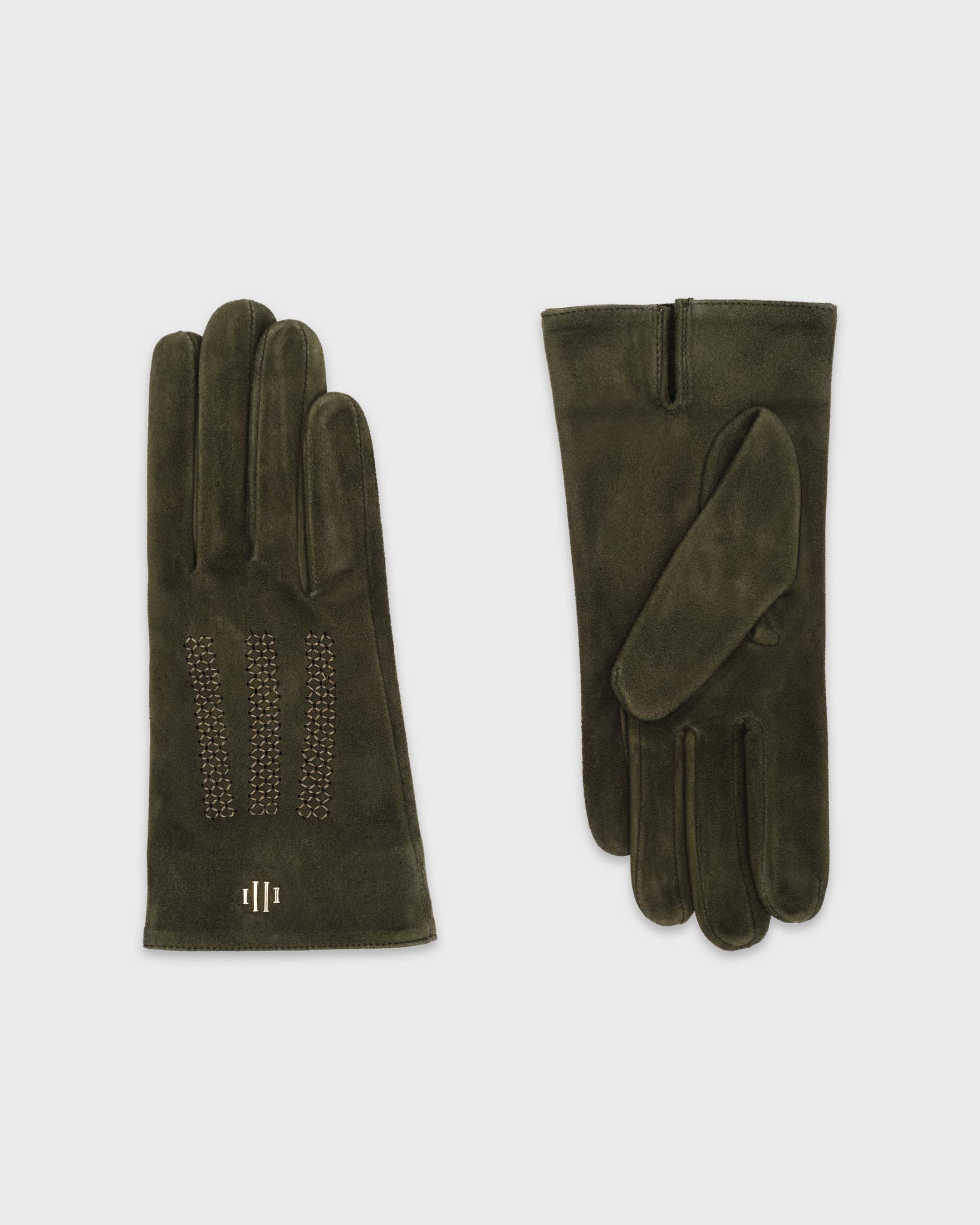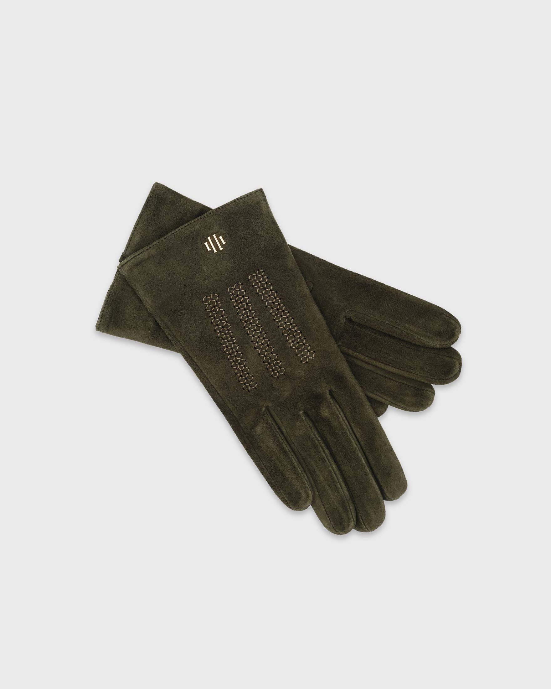 In a deep Verde green, this pair of Hamerli gloves exudes a quiet sophistication. Crafted from velvety-soft suede and brought to life through precise hand-finished detailing, it offers a graceful balance between comfort and refinement. Unlined for a fluid, second-skin feel, while the golden emblem offers a discreet touch of distinction.